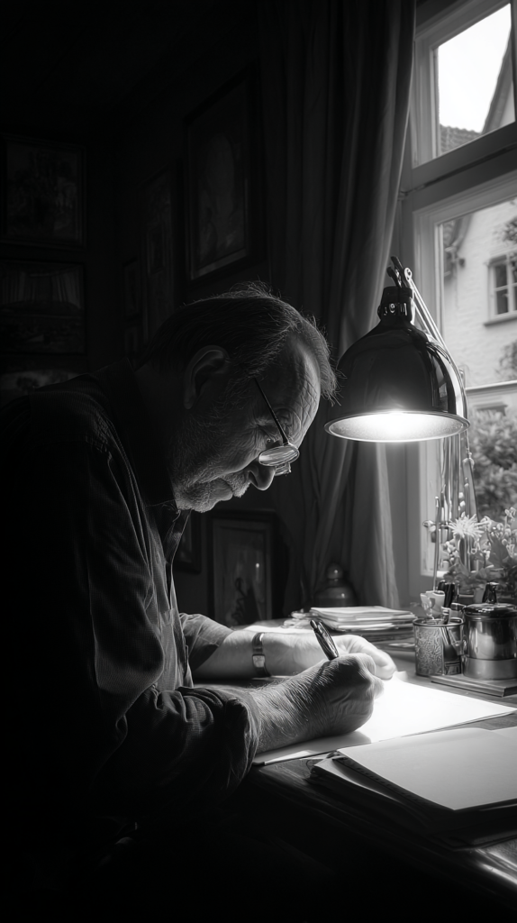 Er las den Brief nochmals durch, nickte dabei, als wolle er sich selbst zustimmen, das Richtige zu Papier gebracht zu haben. Dann faltete er mit seinen alten, zittrigen Händen den Brief zusammen und steckte ihn in einen Briefumschlag. Mit der Zunge fuhr er über die Gummierung und klebte ihn zu. Im Anschluss legte er den Brief, ohne Adresse, auf die Fensterbank und legte sich schlafen.